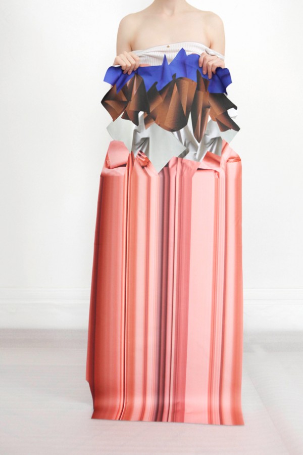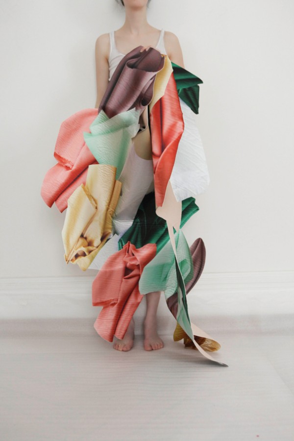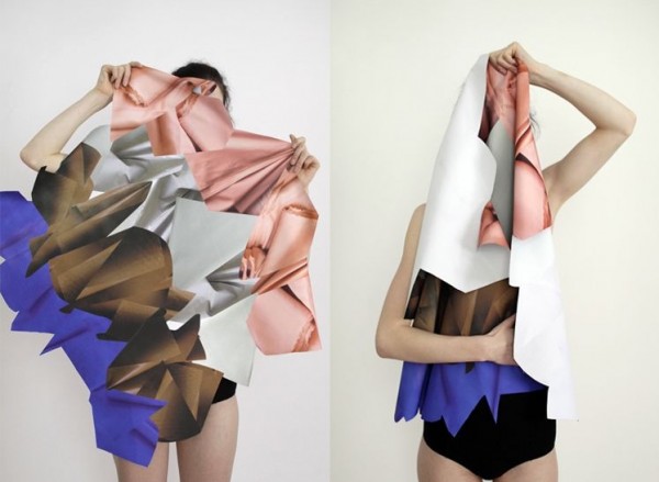 Ela cria tecidos que são o resultado de colagens outros tecidos. Jogue dobras, combina materiais e formas.
